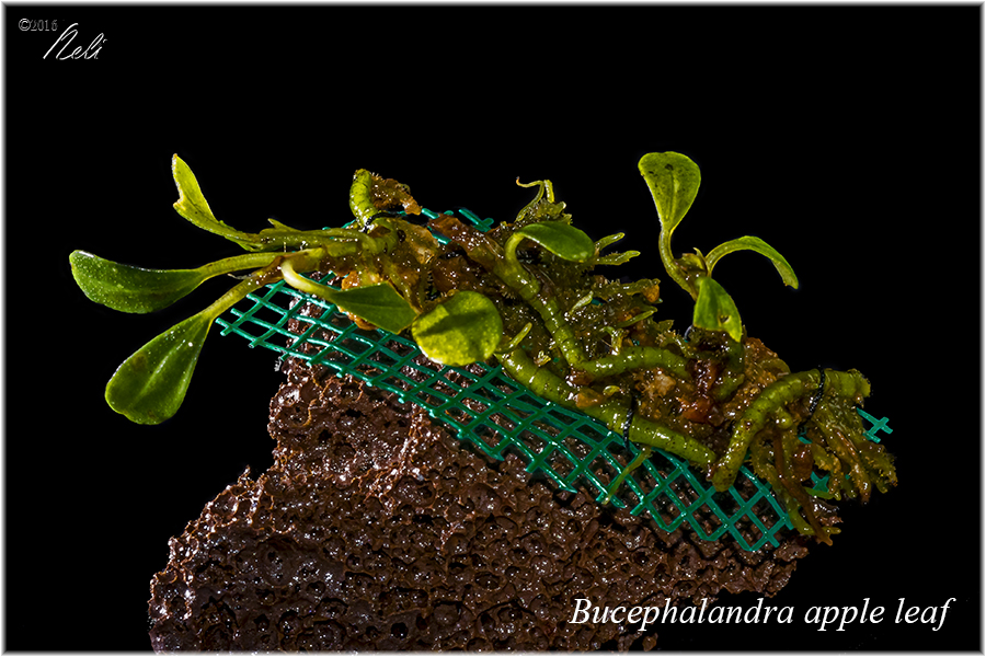 Esta es de las bucephalandras más pequeñas. Está fijada sobre un trozo de tela de mosquitera, pero para tener una idea del tamaño real mejor ver una fotografía con un testigo médico al lado.